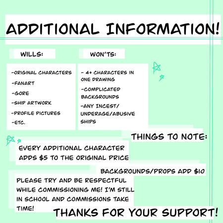 my commission prices are NON-NEGOTIABLE. do not try and haggle with me, my prices are set in stone and will not change for anyone.